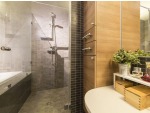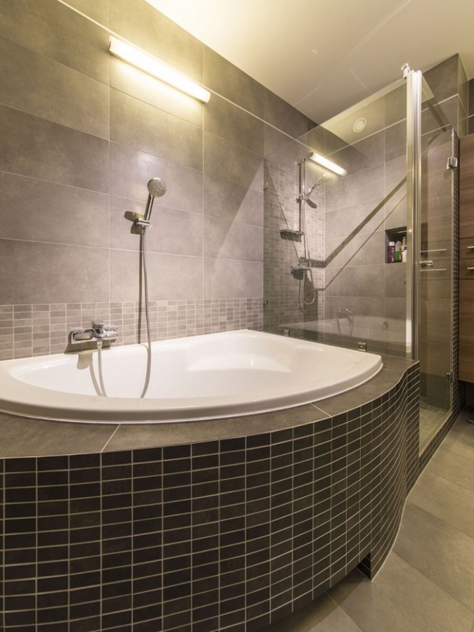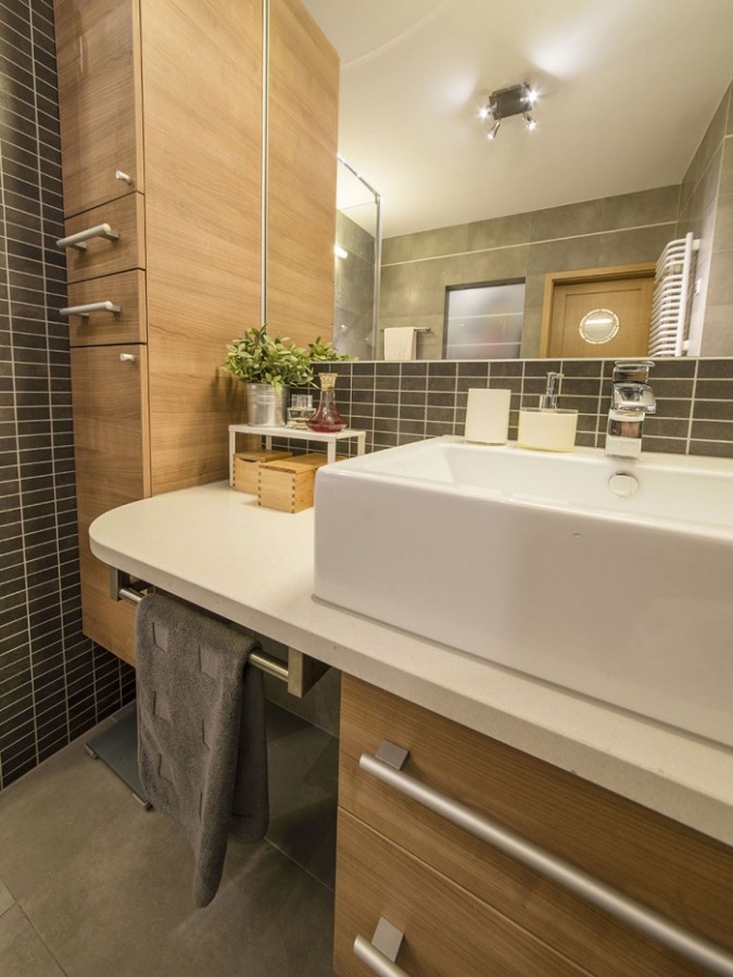 Prezentujemy tutaj zdjęcia z realizacji projektu łazienki utrzymanej w kolorach szarości i grafitu. Całość ocieplona drewnem w połączeniu z elementami chromowanymi i bielą dodaje jej dyskretnej elegancji i sprawia, że na pozór ciemna łazienka jest bardziej przytulna niż zimna.