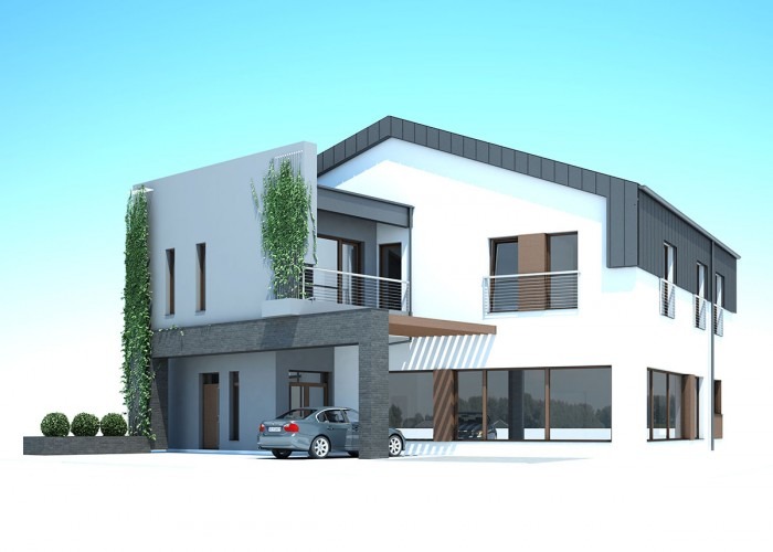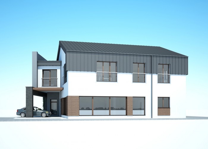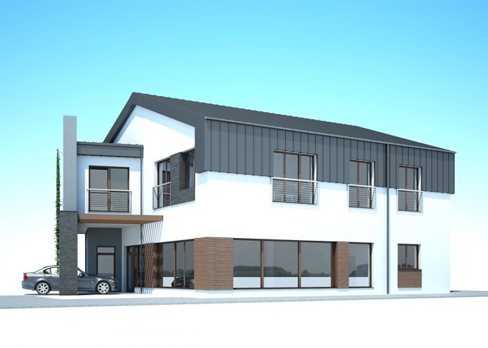 Prezentujemy projekt koncepcyjny budynku usługowo-mieszkalnego. Parter to ok. 100 m2 powierzchnii przeznaczonej na usługi, całe zaś piętro przeznaczone jest na mieszkanie. Budynek ma powstać przy ul. Cegielnianej w Biłgoraju.
